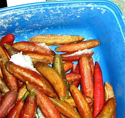 I happened to ask J, the permaculture gardener (see new studio post following this post), what she knew about finger limes."just a minute!" said she "come... look...I have some in my freezer!"
